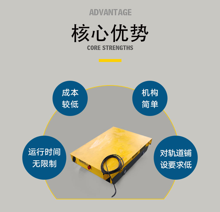 1.安全載重系數高 平車采用箱梁式結構,車輪采用的車加工,熱處理,平車的安全系數可以達到1.5 2.自動化程度高 平車可以增加plc,實現自動化對接,無人操作車間 3.短途運行