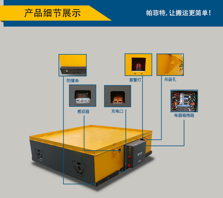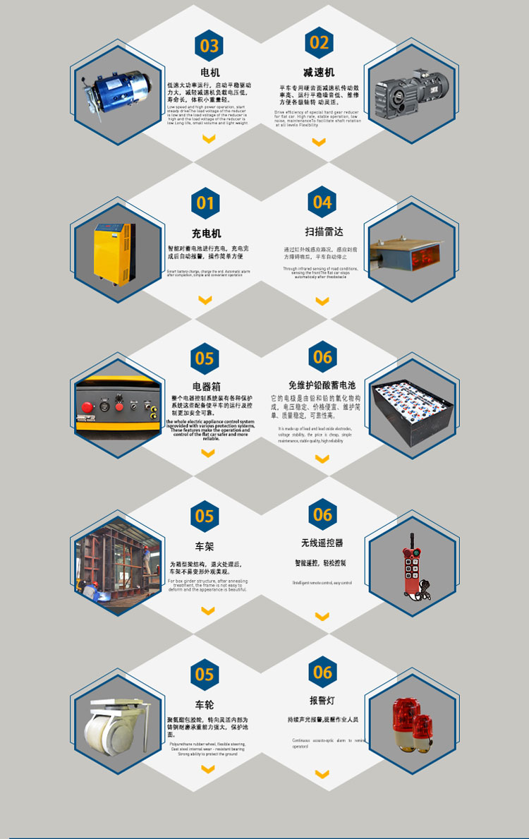 3噸無軌平板車是一種電動有軌廠內運輸車輛。又稱臺車、過跨車、地爬車。它具有結 構簡單、使用方便、容易維護、承載能力大、污染少等優點,而作為短距離運輸工具得到廣 泛應用,也可作為車間內部配合吊車運輸重物過跨之用。